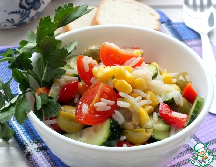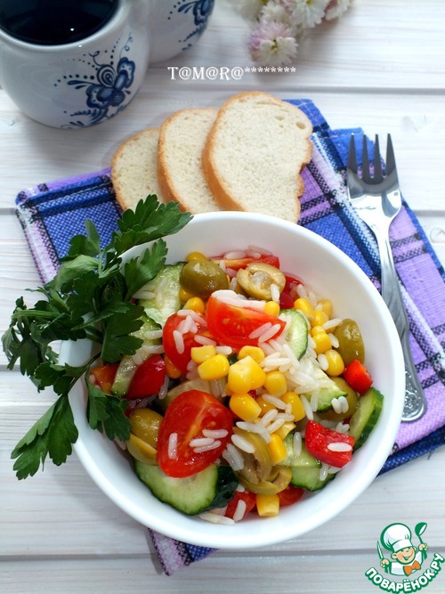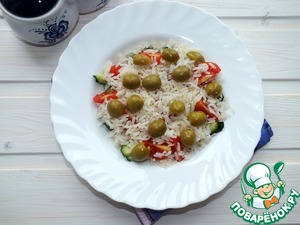 Оливки разрежем на две половинки, добавляем рассыпчатый рис