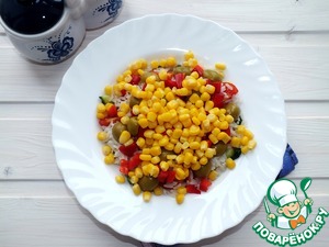 Выкладываем красный перец, нарезанный брусочками и кукурузу без жидкости. Заправляем растительным маслом, посолим, перемешаем и выкладываем в салатник. Оформляем зеленью.