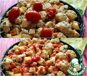 Помидор давим и убираем кожицу. Распределяем по поверхности.
