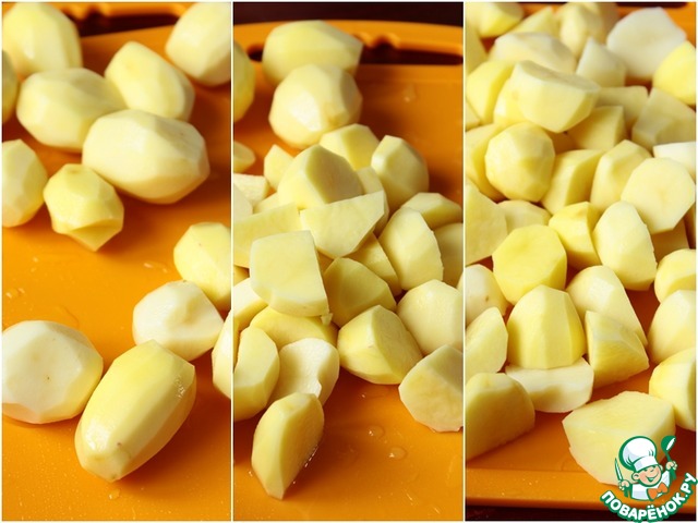 Маленькие клубни очищенного картофеля режем на две, три, четыре части.