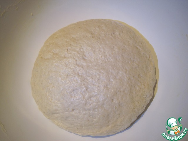 • Вот так увеличилось моё тесто уже через полчаса. Я его обмяла и снова убрала в тёплое место.