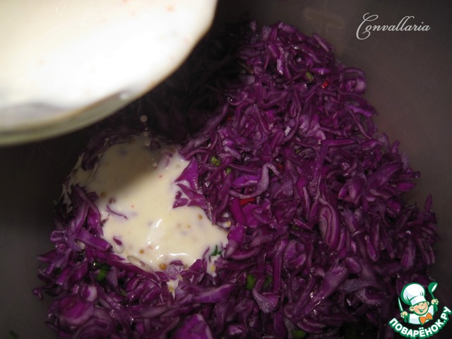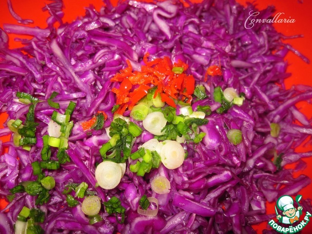 Краснокочанную капусту тонко нашинковать, немного посолить и помять руками. Добавить мелко нарезанный зеленый лук и перец чили (без семян).