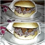 Необыкновенно вкусный и сытный сэндвич из свежей, мягкой булочки с обжаренным мясом и острым капустным салатом в оригинальном соусе.