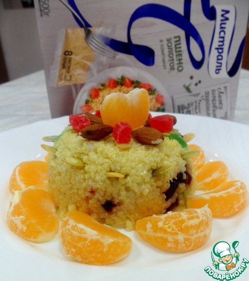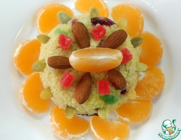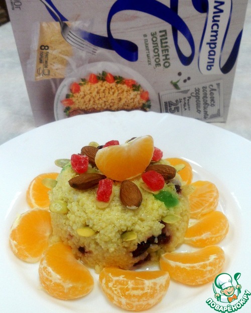 Выложить пшено на тарелку аккуратной горкой, украсить цукатами, миндалем, тыквенными семечками и мандаринами. Мандарины придадут особый освежающий вкус нашему блюду.