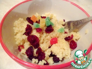 Смешать готовое пшено с сушеной клюквой и цукатами, добавить мед по вкусу и перемешать.