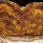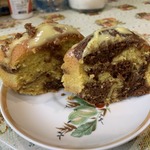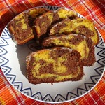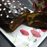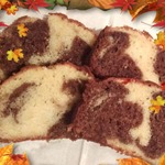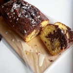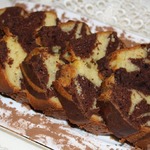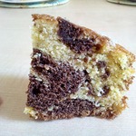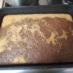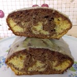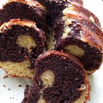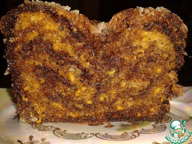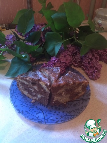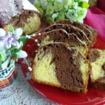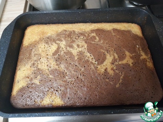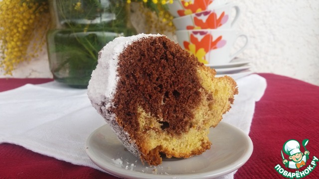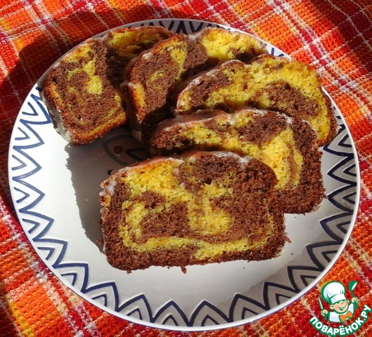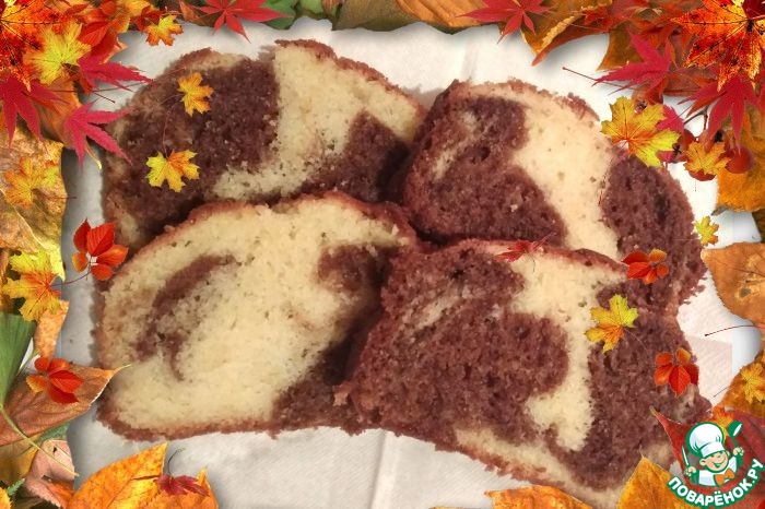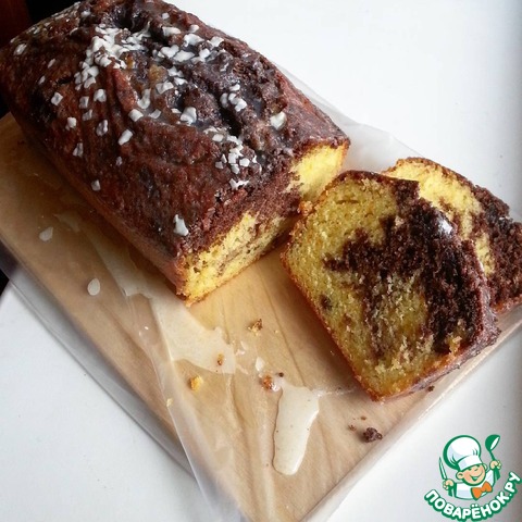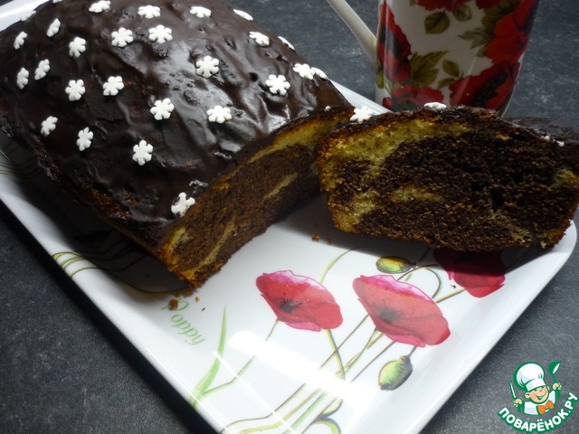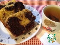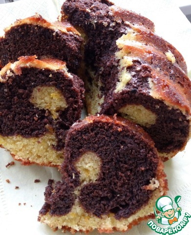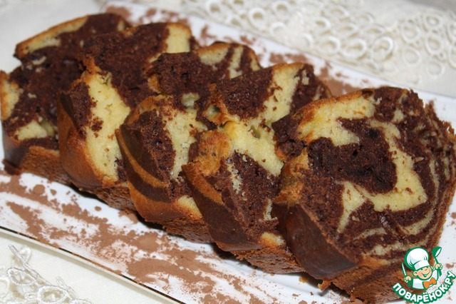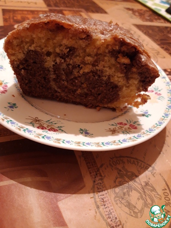 В смазанную форму из-под кекса выложить тесто в шахматном порядке, палочкой сделать разводы. Выпекать 50 минут при темпер. 180*. По готовности остудить.