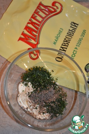 Укроп вымыть, обсушить и мелко нарезать. Кориандр обжарить на сухой сковороде 2-3 минуты, постоянно потряхивая сковороду. Затем растереть его в ступке. Укроп и измельченный кориандр смешать с 3 ст. л. оливкового майонеза Махеев.