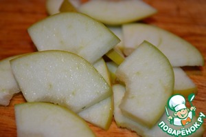 Яблоко вымыть. Удалить сердцевину и разрезать на четыре части, затем каждую часть нарезать на тонкие ломтики. Чтобы яблоко не потемнело, сбрызнуть его лимонным соком.