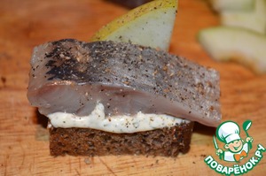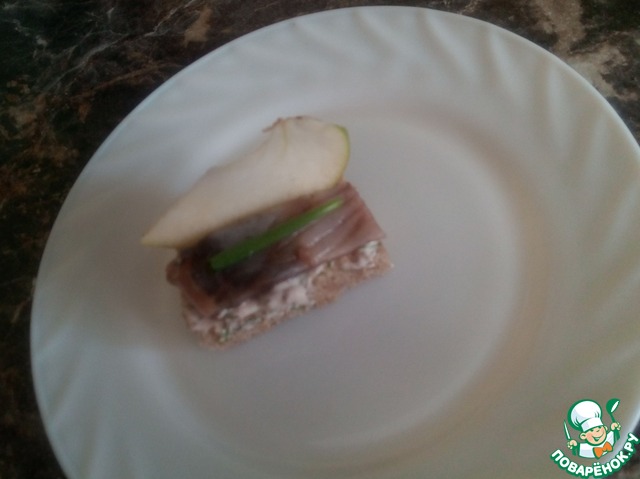 Превосходнная закуска, так сказать, классика жанра. Бородинский хлеб, кусочек сельди, майонез, приправленный укропом и кориандром, ломтик кисло-сладкого яблока и черный перец, все это великолепно сочетается в маленьком, но очень вкусном бутерброде.