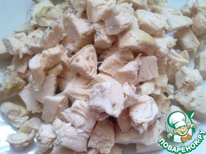 Куриное филе отварить в подсоленной воде до готовности и нарезать небольшими кубиками.