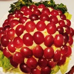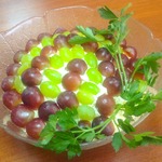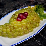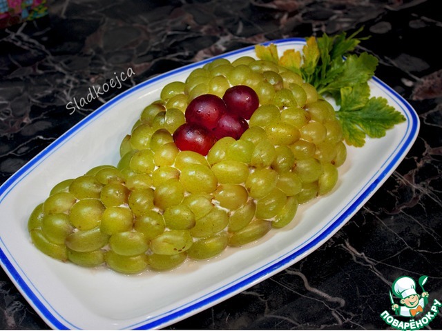 Укладываем на салат половинки ягод винограда, стараясь имитировать гроздь. Разложить ягодки в хаотическом, но приближенном к истине порядке.