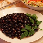 Эстетический момент - это украшение салата. Виноград моем, снимаем с грозди ягодки и разрезаем каждую вдоль пополам. Если все - таки виноград попался с косточками, придется потрудиться - нужно удалить каждую косточку.