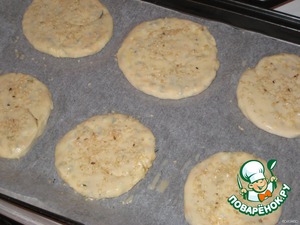 Выложить лепешки на противень, смазать разболтанным яйцом и посыпать кунжутом.