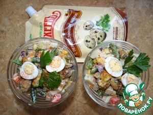 Нежный, ароматный и сытный овощной салат с мясом мидий и тонким ароматом муската под майонезом на перепелином яйце!