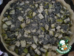 Грушу нарезать мелким кубиком, и смешать с маком, добавить крахмал, взбитые белки и перемешать.
