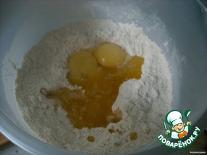 Масло растопить и смешать с молоком, влить коньяк, добавить желтки и смешать с мукой.