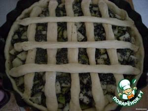 И остальную часть теста раскатать и выложить в виде решетки на начинку.