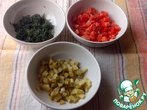 Помидоры, маринованные огурцы (срезать кожуру)- нарезать мелким кубиком, укроп-мелко порезать.