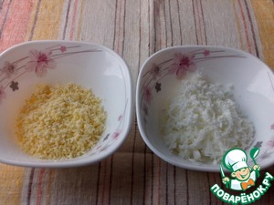 Яйца разобрать на желтки и белки. Натереть их на мелкой терке в отдельные пиалки.
