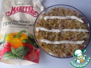 1 слой - свежий огурец + майонез. Я использовала майонез Провансаль ТМ "Махеев." -