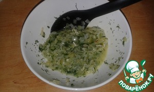 Для начинки лук мелко порезать и обжарить, чеснок измельчить, укроп мелко порезать и смешать с мягким сливочным маслом