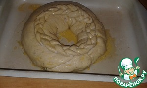 Тесто свернуть рулетом, а далее оформить по желанию или просто испечь так. Я свернула из калача, а из кусочка отложенного теста сделала косичку. Смазать хлебушек яйцом и оставить расстаиваться минут на 15-20. Затем выпекать в духовке.