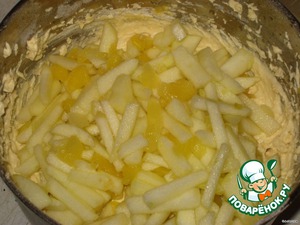 Добавить в тесто порезанные фрукты, перемешать ложкой.