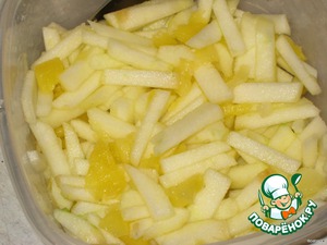 Яблоки очистить от кожуры, мелко порезать, смешать с ананасом, сбрызнуть лимонным соком и перемешать.