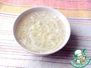 Лук замариновать - залить кипятком с добавлением уксуса, оставить мариноваться на 30 минут, затем воду слить.