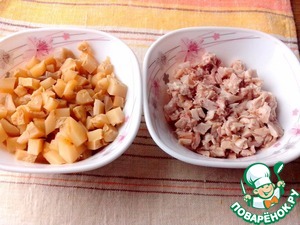 Отваренное куриное мясо и грузди нарезать небольшими кусочками. Вместо груздей можно использовать маринованные опята или шампиньоны.