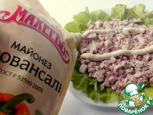 На листья салата выложить кусочки курицы, смазать майонезом. Я использовала майонез провансаль ТМ "Махеев".