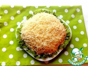 Последний слой салата — сыр, натёртый на мелкой тёрке. Салат готов!