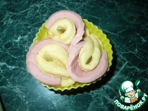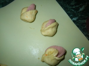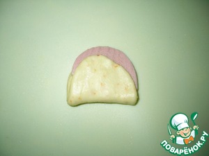Сверху положить полукружок колбасы ( у меня колбаса тоже в диаметре 5 см)и сложить пополам