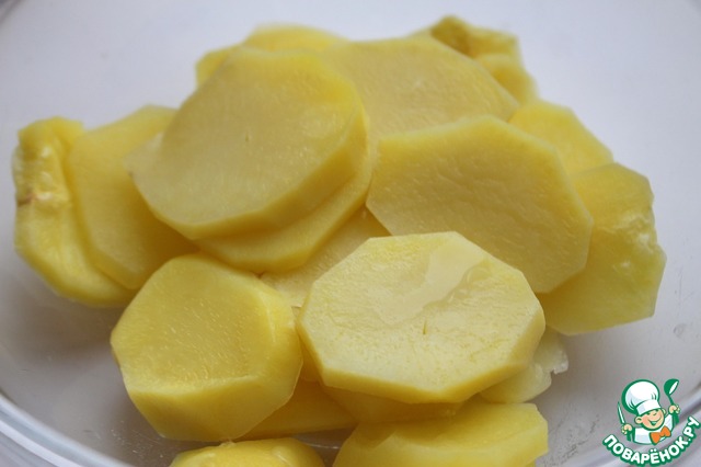 • Картофель почистить, отварить в подсоленной воде до готовности, нарезать кружочками.