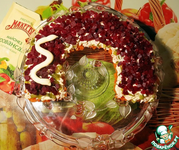 4 Слой. Свеклу режем кубиками, выкладываем на огурчики, смазываем небольшим количеством майонеза. Оставить немного для украшения, если не используем краснокочанную капусту.