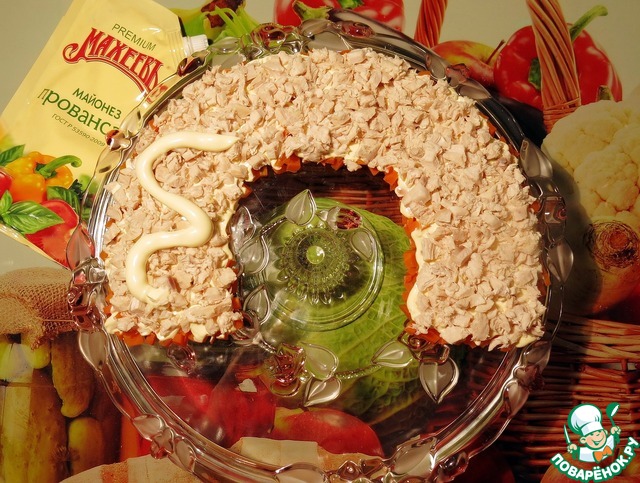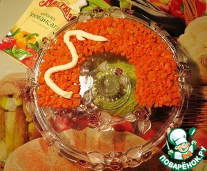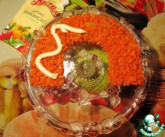 1 Слой. Морковь режем кубиками, выкладываем в виде дуги на блюдо (у меня это тортница :)), смазываем небольшим количеством майонеза. Немного моркови оставляем на украшение. -