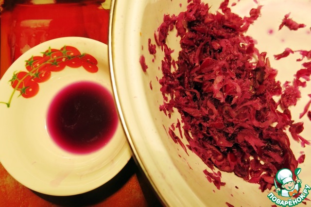 Далее готовимся к самому ответственному моменту. К созданию радуги. :) Для начала натрем на мелкой терке грамм 70-80 краснокочанной капусты и отожмем в отдельную чашечку её сок. Затем 2 вареных яйца разделим на белок и желток. Белок натрем на мелкой терке и смешиваем с соком капусты, т. о. получаем "материал" для голубой полоски. :)