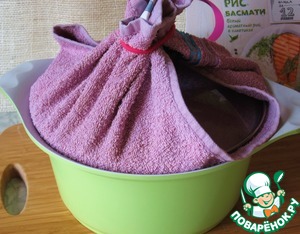 У иранских хозяек есть специальные полотенца на резинках, что очень удобно, а я выкрутилась вот так. Смысл полотенца в том, что когда рис пропаривается, вода испаряется и оседает на полотенце (впитывается), это не дает воде попасть обратно на рис и он получается очень легким, воздушным и очень рассыпчатым. Пропаривать рис можно от 20 до 40 минут, т. к. наш рис отличается от иранского, то мне всегда достаточно 15-20 минут. -