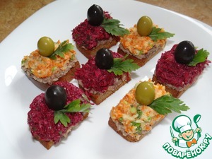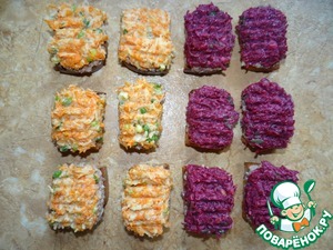 Затем на половину тостов сверху выложить морковную начинку, на другую половину тостов - свекольную;