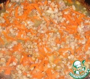 Пока выпекается корж, приготовим начинку. Режем мелко репчатый лук, обжариваем его на растительном масле до слегка золотистого цвета. Затем добавляем натертую на крупной терке морковь. Обжариваем около 2-х минут. Делаем это все на медленном огне. Затем кладем фарш, соль, перед душистый, мускатный орех. Перемешиваем и тушим под закрытой крышкой до готовности.