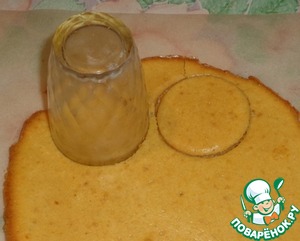 С помощью 100-граммового стакана вырезаем кружочки из теплого коржа. Тесто мягкое, поэтому кружочки хорошо вырезаются. Из обрезком делаем крошку.
