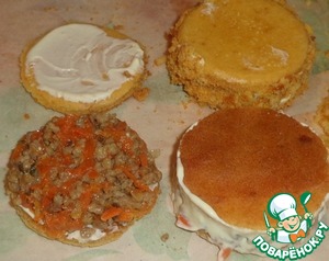 Берем кружочек и смазываем его майонезом. Сверху выкладываем слой мясной начинки (толщиной больше чем корж). Затем кладем сверху другой кружочек, смазанный майонезом.