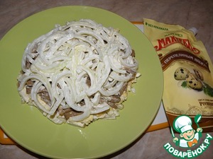 3ий слой печень ( промазать майонезом), 4 слой лук ( перемешать с майонезом)