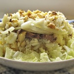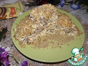 5ый слой еще 3 яйца ( перемешать с майонезом) и верх посыпать рубленными орехами. Дать салату чуть настоятся.