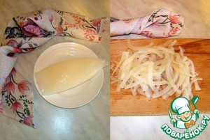 Тушку кальмара размораживаем и опускаем в кипящую подсоленную воду на 2-3 минуты. Остужаем и нарезаем тонкой соломкой.