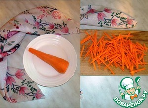 Морковь нарезаем мелкой соломкой и пассеруем на 1 ст. л. оливкового масла.