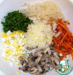 Соединяем все ингредиенты в большой миске. Солим и перчим по вкусу.