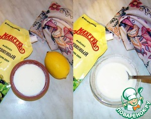 Приготовим заправку из майонеза, йогурта и сока лимона. Ориентируйтесь тут на кислоту йогурта и регулируйте по своему вкусу количество кислоты.