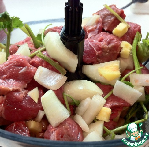 Измельчить в блендере мясо, репчатый лук, стебли кинзы и очищенный имбирь. Если Вы используете мясорубку, фарш нужно прокрутить 2-3 раза.