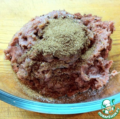 Добавить к фаршу соль, чёрный молотый перец и кориандр. Хорошенько вымесить и отбить.